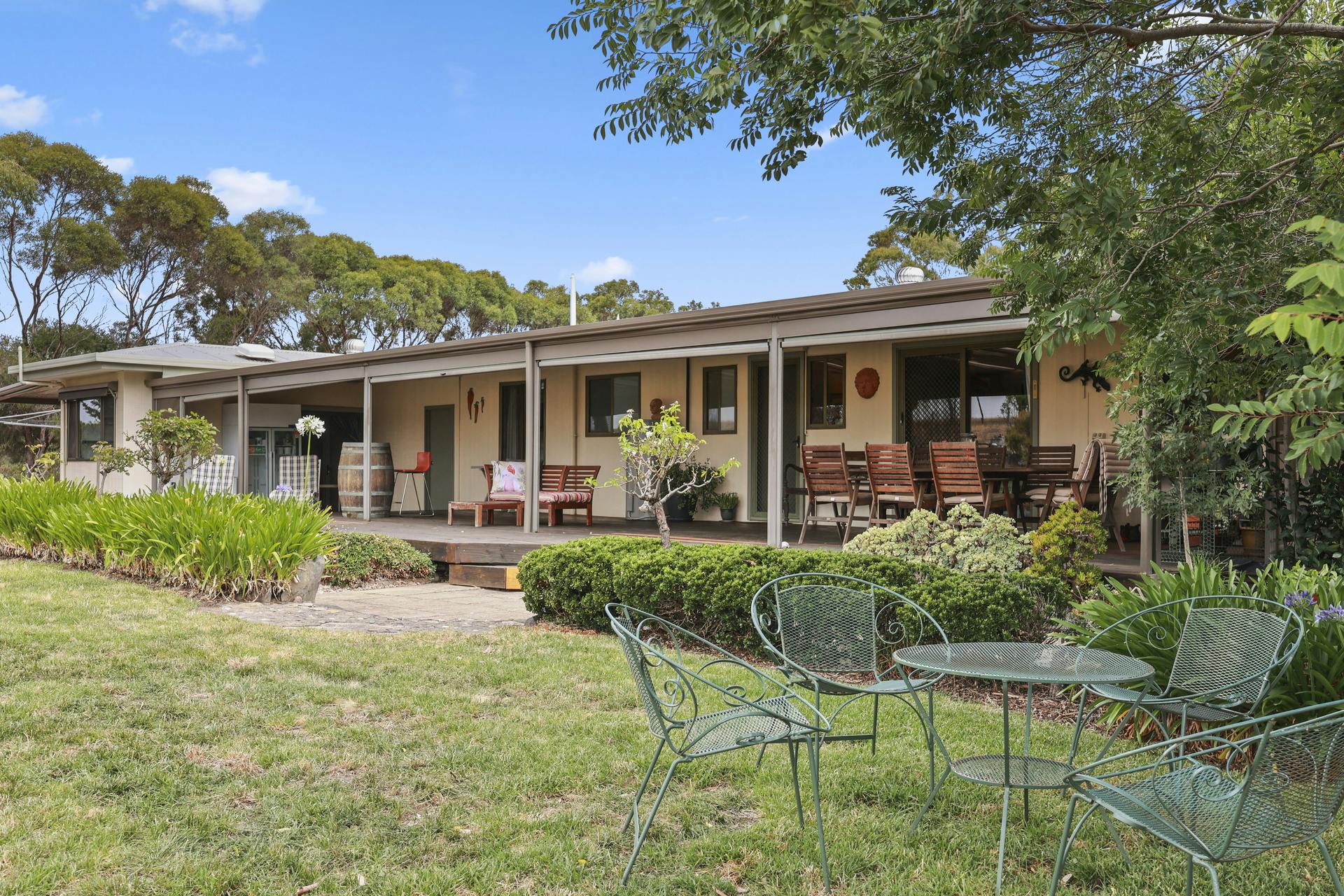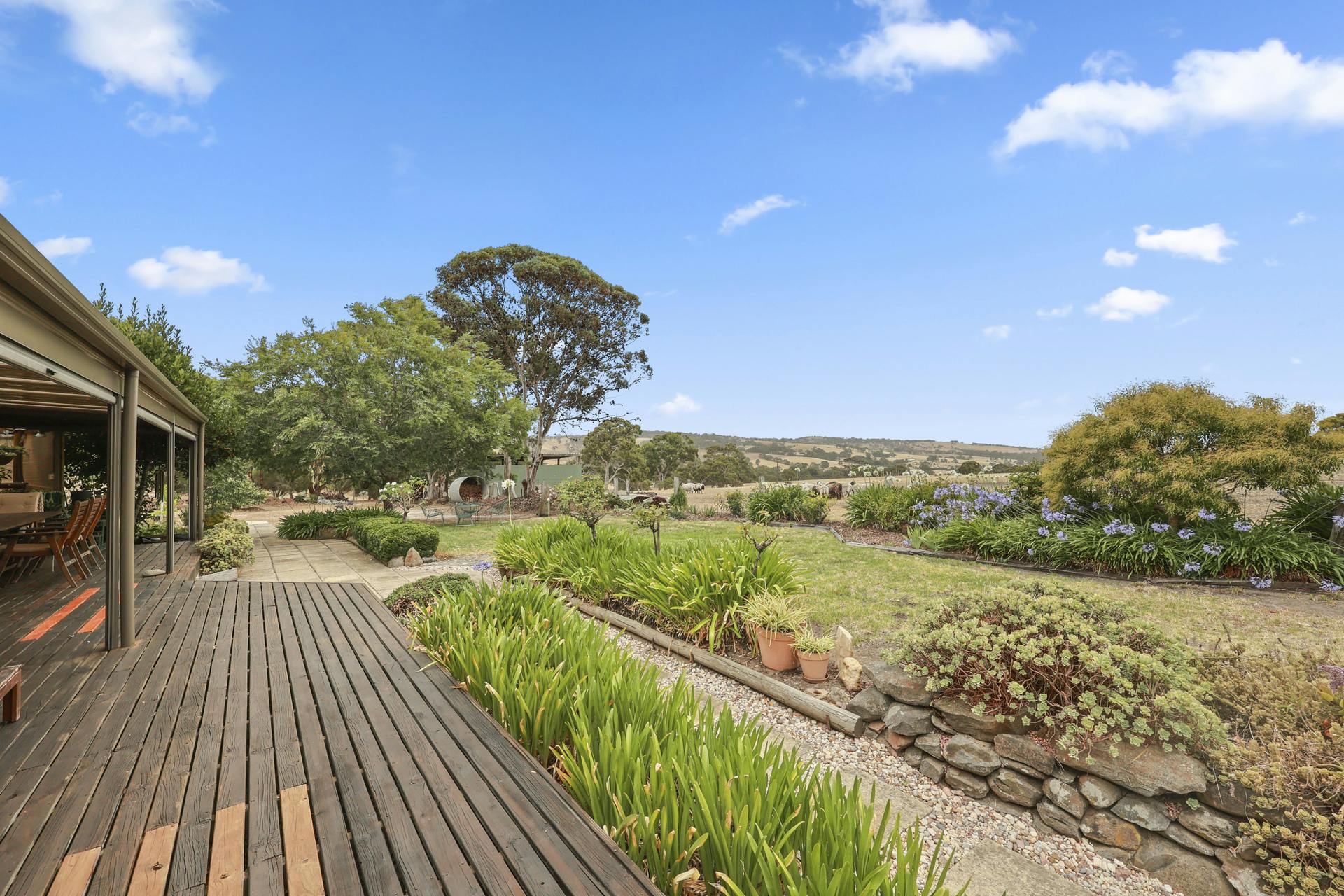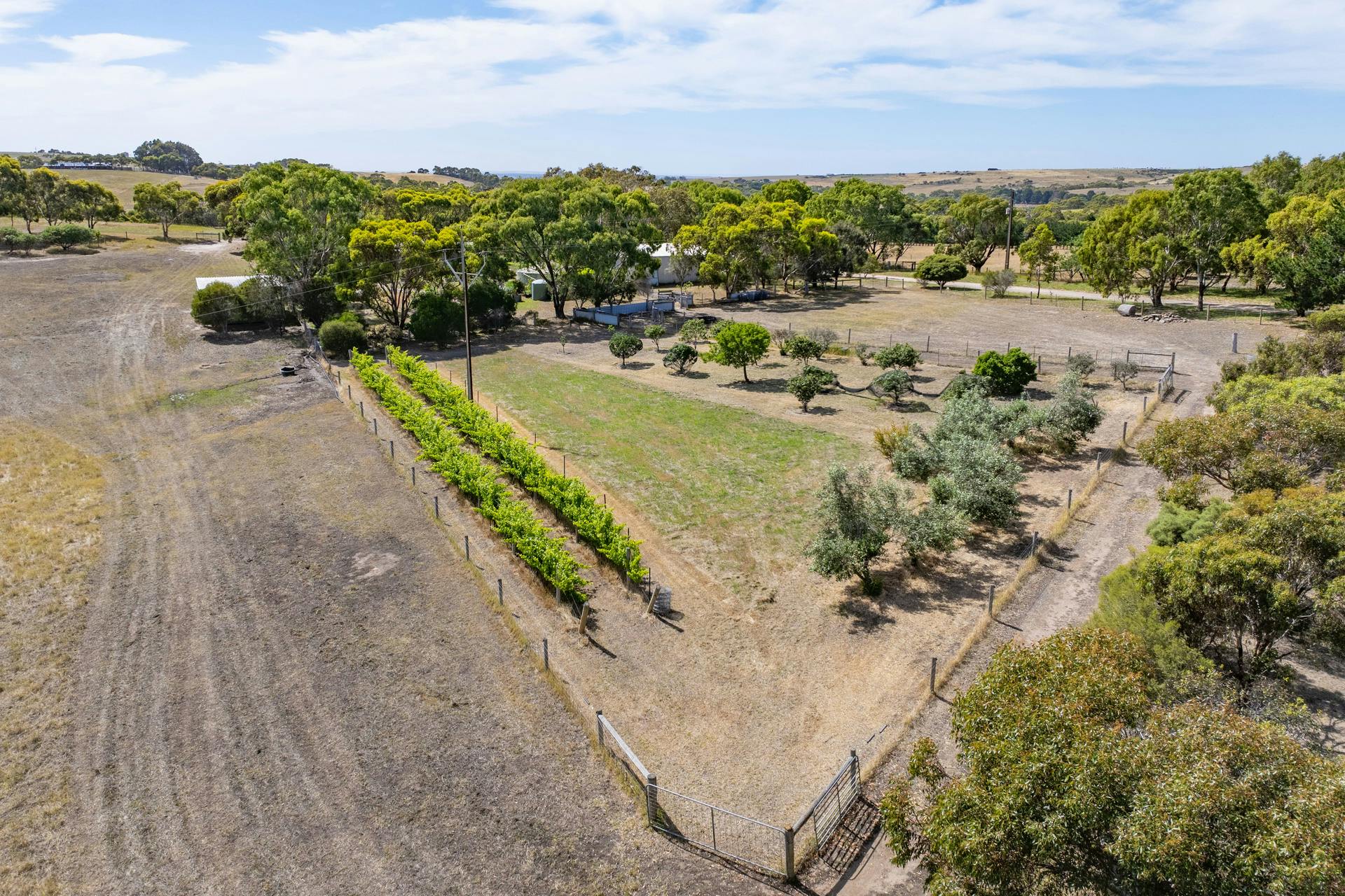 The property comprises three well-fenced paddocks of approximately 10 acres each, two dams and gently undulated land ideal for livestock, horses or hobby farming. Established features include a productive fruit orchard and olive grove, organic vegetable garden and a 25-year-old vineyard producing delicious small-batch Shiraz. There is also scope for a multi-generational estate with options to build an elevated extension to capture some amazing coastal views or an additional dwelling (STCC).