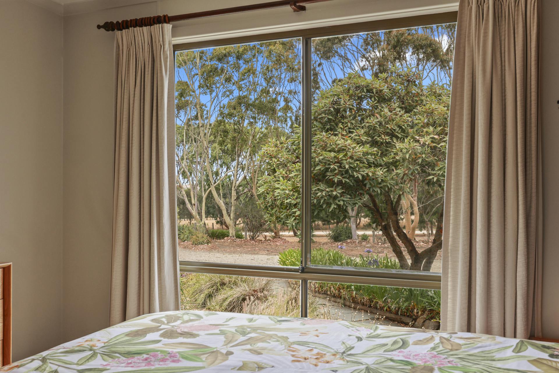 Three well presented bedrooms include built-in robes and scenic rural views. The bathroom offers a freestanding vanity, separate bath and modern fixtures, while a separate toilet, laundry with direct access to spacious undercover drying area, and a double garage add convenience.